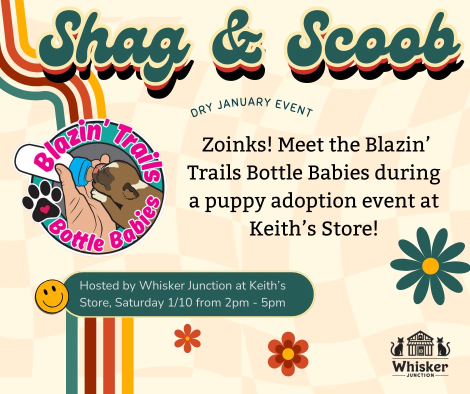 Blazin’ Trails Bottle Babies is joining Whisker Junction for a special puppy adoption event during the Shag & Scoob Dry January celebration at Keith’s Store.